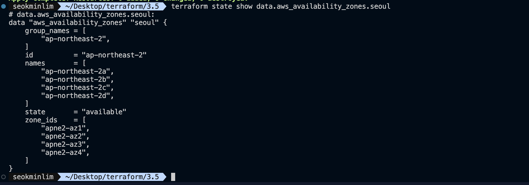 terraform state show data.aws_availability_zones.seoul