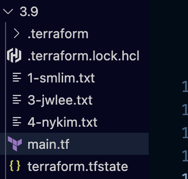 - count 값을 var.users의 길이로 참조하였고, 인덱스로 변수에 접근을 하면, 0-smlim.txt / 1-yjna.txt / 2-jwlee.txt / 3-nykim.txt 파일이 생성된다.