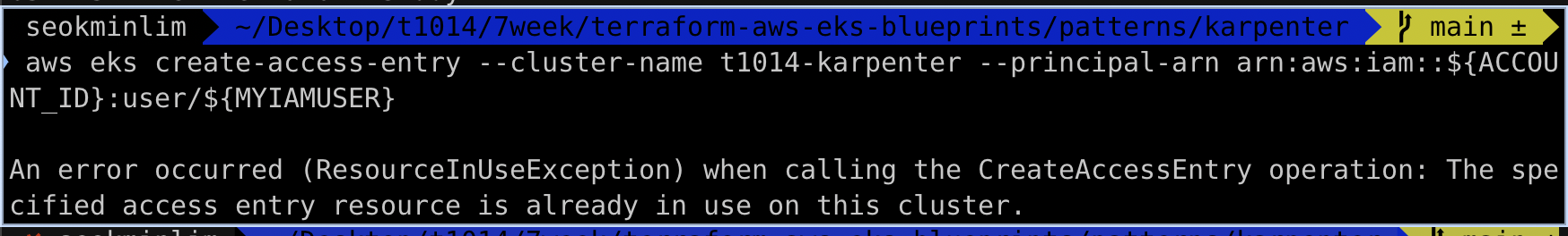 aws eks create-access-entry --cluster-name t1014-karpenter --principal-arn arn:aws:iam::${ACCOUNT_ID}:user/${MYIAMUSER}