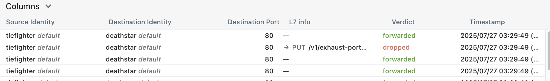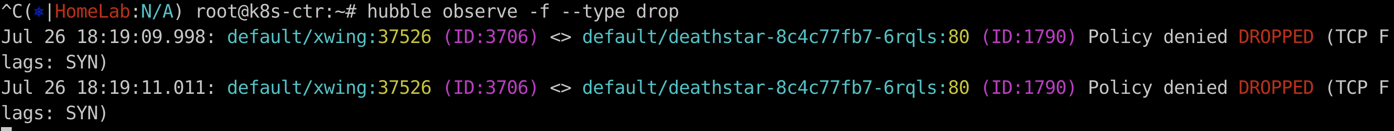 아래 command로 xwing pod에서 deathstar 서비스로 curl 요청을 2번 했더니, drop 된 것을 확인할 수 있다.