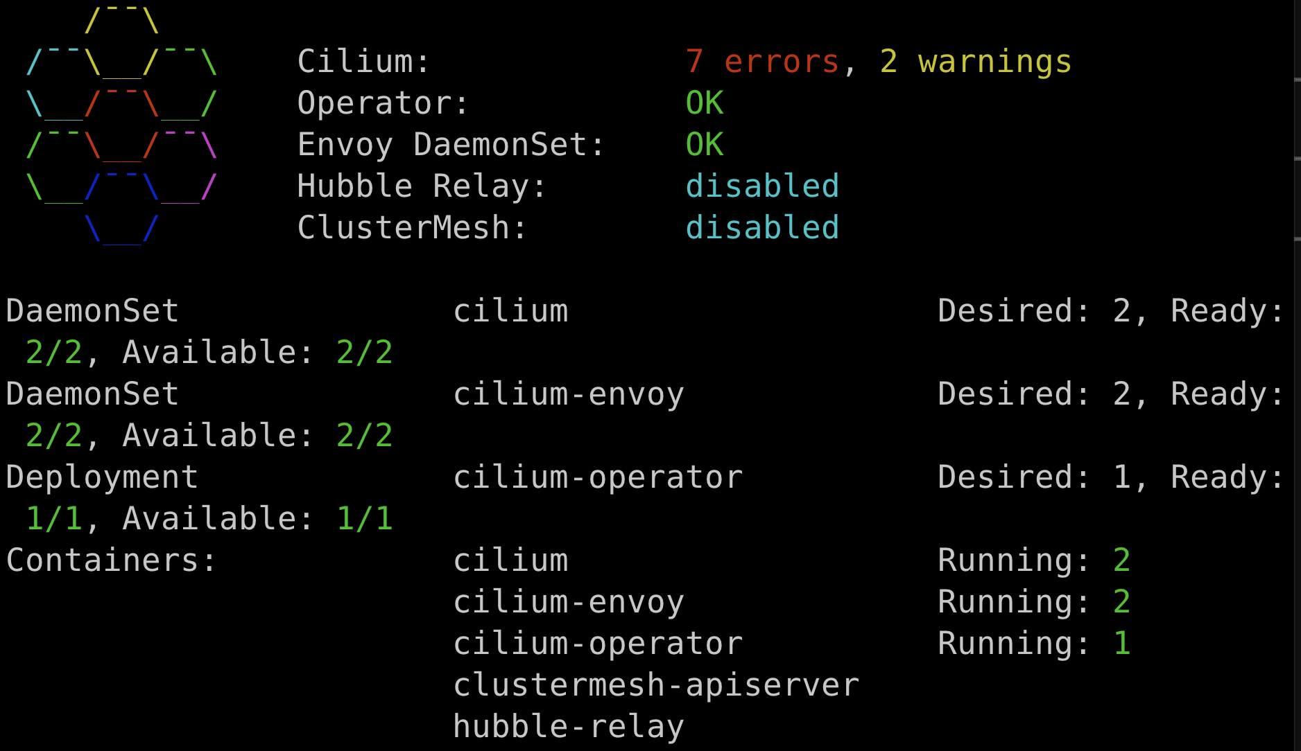 └ remote configuration: expected=true, retrieved=true, cluster-id=2, kvstoremesh=false, sync-canaries=true, service-exports=disabled