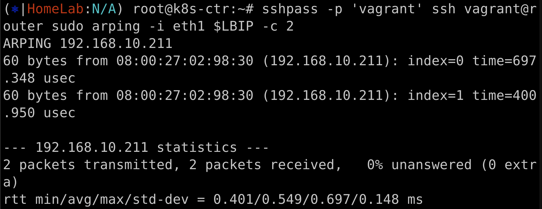 sshpass -p 'vagrant' ssh vagrant@router sudo arping -i eth1 $LBIP -c 2