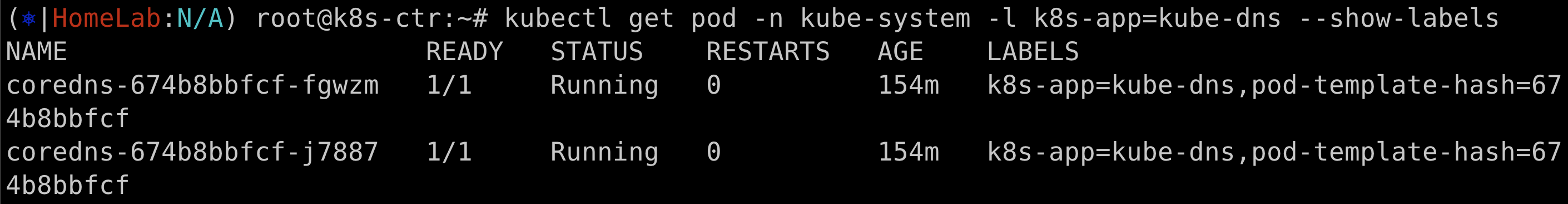 kubectl get pod -n kube-system -l k8s-app=kube-dns --show-labels