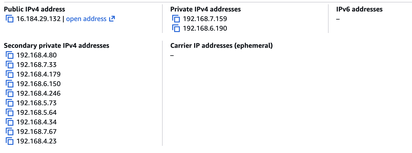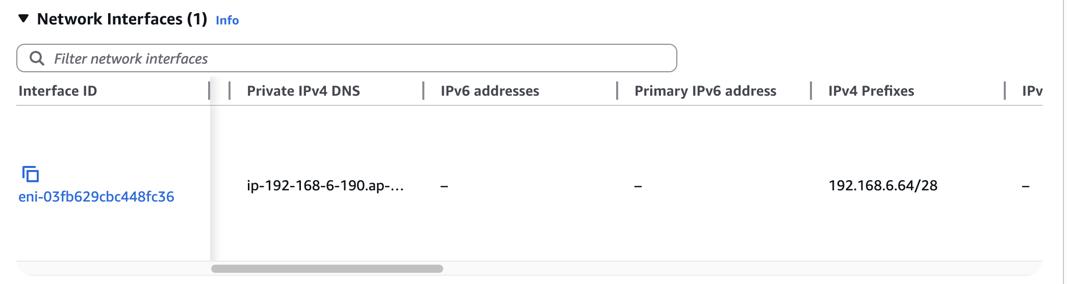 아래 ENI 세부정보에 가면 IPV4 Prefixes에 Primary ENI와 같은 서브넷에 있는 16개의 IP 블록(192.168.6.64/28) 이 있는 것을 볼 수 있다.