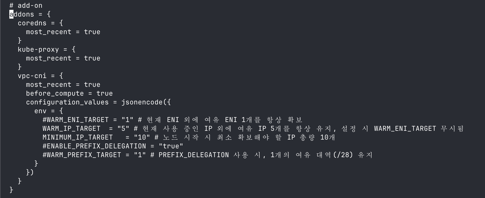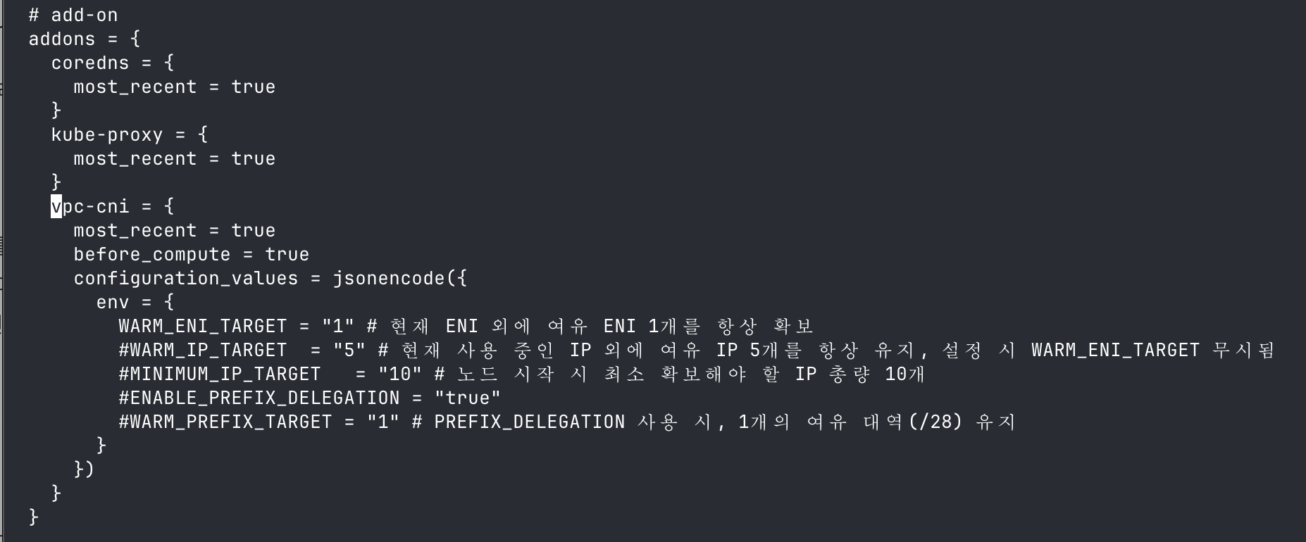 Terraform 에서는 VPC CNI addon 의 환경변수 설정을 통해서 조정할 수 있다.